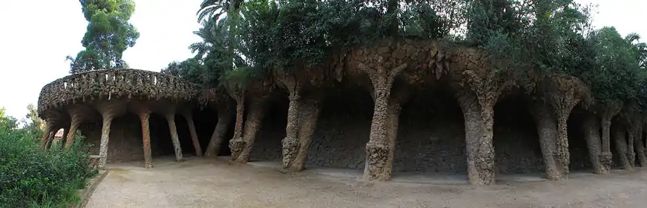 Для парку Гуель за приклад Гауді взяв принцип англійських парків, однак наповнив свій сад архітектурними роботами в стилі ар нуво. У Гауді колони перетворюються на стовбури дерев, які нахилені під непрямими кутами до поверхонь, стелі побудов зроблені з каміння, що створює враження непевності та хисткості.