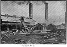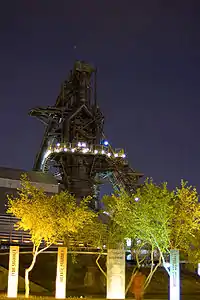 | Доменна піч № 3 у парку Фундідора. На колошниковій площадці пічі зроблено оглядовий майданчик. На фото видно відвідувачів парку, які піднялися на цю площадку. | ||||