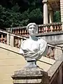 - На середній терасі, прямо над лабіринтом, розташовані два павільйони в італійському стилі з тосканськими колонами та статуями Данаї й Аріадни, точні копії круглих давньоримських храмів без целли. Поруч з великими сходами, що ведуть на третій рівень, знаходиться статуя бога вина і виноробства Діоніса.
