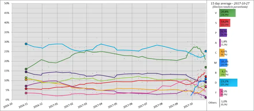 | MBL | 9–12 жовтня 2017 | 1,250 | 22.6 | 27.4 | 9.2 | 5.5 | 3.4 | 2.6 | 15.3 | 6.5 | 6.4 | 1.1 | Ліво-зелений рух 4.8 |