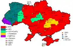 | Народний Рух України | 9,40 % | 32 / 225 |