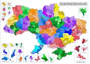 Центральна виборча комісія України постановою № 82 «Про утворення одномандатних виборчих округів на постійній основі у межах Автономної Республіки Крим, областей, міст Києва та Севастополя» від 28 квітня 2012 утворила 225 виборчих округів, середня кількість виборців в одному окрузі, виходячи з даних державного реєстру, становить 161 140 осіб, допустиме відхилення від цієї чисельності — 12%. В Південно-Східних областях є 106 мандатів, а в Центрально-Західних областях 119 мандатів.[44][45].