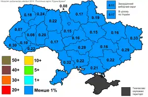 | ↑ Голосування за умовно «проукраїнські» або «проросійські» партії за округами |