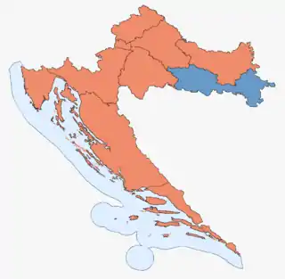 ![]() Результати виборів у кожному з десяти виборчих округів Хорватії: партія з більшістю голосів у кожному виборчому округу | ||||