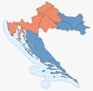 ![]() Результати виборів у кожному з десяти виборчих округів Хорватії: партія з більшістю голосів у кожному виборчому округу | ||||
