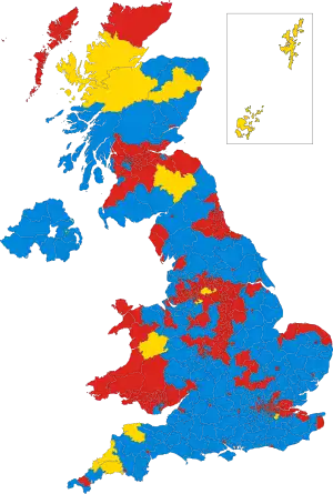 - The BBC lists this result as 363 seats, which would give a majority of 96, due to the Speaker's seat being listed as «other», although the BBC tends to include the Speaker in the party totals. 364 seats would naturally result in a majority of 98.