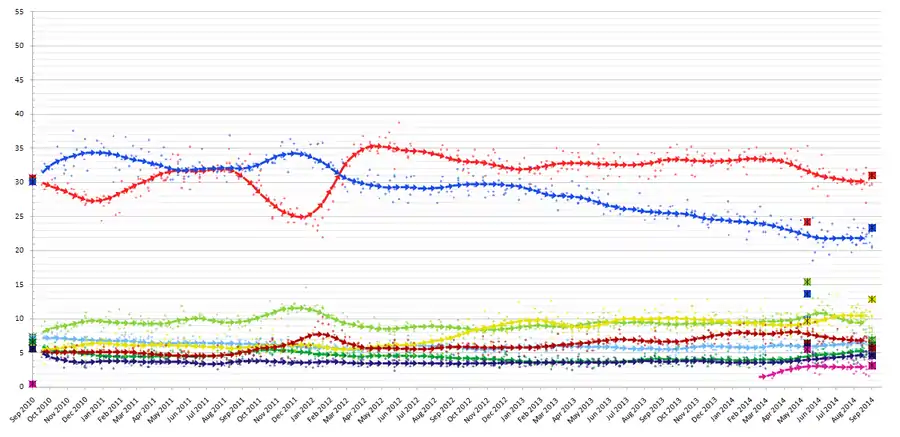 | 14 Sep 2014 | General Election | 31.0 | 23.3 | 6.9 | 5.4 | 6.1 | 12.9 | 5.7 | 4.6 | 3.1 | 1.0 | 7.7 |