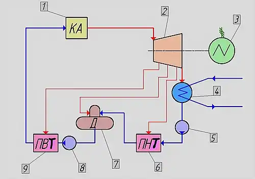 Свіжа пара з котельного агрегату (1), де він отримав тепло від згоряння палива, надходить в турбіну (2) і, розширюючись в ній, здійснює механічну роботу, обертаючи ротор електрогенератора (3). Після виходу з турбіни пар надходить в конденсатор (4), де відбувається його конденсація. Конденсат відпрацьованої в турбіні пари за допомогою конденсатного насосу (5) проходить через підігрівач низького тиску (ПНТ) (6) в деаератор (7). З деаератора живильний насос (8) подає воду через підігрівач високого тиску (ПВТ) (9) в котельний агрегат.