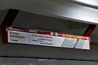 Виходи зі станції ведуть до торговельного центру «Підземне Місто», готелю «Турист», універмагу «Білорусь», Партизанського проспекту, вул. Довгобродської і парку ім. 50-річчя Жовтня.