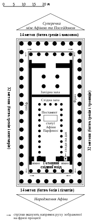Коли Ви роздивляєтесь так званий передній фронтон, можна побачити, що його скульптури зображують народження Афіни. Сюжет заднього фронтону складає суперечку Афіни та Посейдона за панування в Аттиці[12].