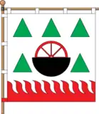 Квадратне полотнище поземно поділене язиками полум'я на білу і червону смуги у співвідношенні 5:1. На верхній смузі чорний казан, з якого виходить половина червоного колеса від воза. Вгорі та з боків казана п'ять зелених трикутників.