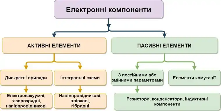 Номенклатура пасивних елементів досить широка (хоча, можливо, і не настільки широка, як номенклатура активних). До них відносять резистори, конденсатори, індуктивні компоненти, елементи комутації та інші елементи.