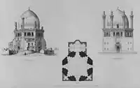 Паскаль Косте. «Мечеть і мавзолей Ісмаіла Кодабенде», місто Сольтаніє, фасад ріїни, план і реконструкція первісного вигляду.