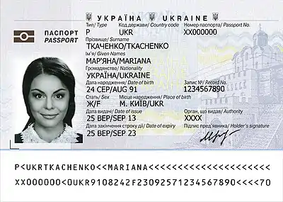 ![]() Лицьовий бік сторінки даних паспорта громадянина України для виїзду за кордон з безконтактним електронним носієм | |