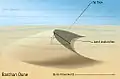 Бархани (дюни у формі напівмісяця) утворюються у пустелі під дією вітру; два роги та внутрішня (ввігнута) сторона спрямовані проти вітру. Під дією вітру пісок піднімається по навітряній (зовнішній) стороні, яка має кут приблизно у 15° з горизонталлю, та падає на підвітряну (внутрішню) сторону, де накопичується до досягнення кута природного укосу піску (приблизно 35°). Коли кут поверхні перевищує кут природного укосу, пісок сходить лавиною, що є нелінійною поведінкою: багаторазове додання невеликих кількостей піску не викликає ніякої дії, а потім наступна невелика кількість викликає схід лавиною великої кількості піску[61]. Крім цієї нелінійності, в іншому бархани поводяться схоже на солітони[62].