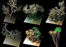 Фрактали — це нескінченно самоподібні, повторювані математичні конструкції, які мають фрактальну розмірність[17][35][36] Нескінченні ітерації у природі неможливі, тому всі «фрактальні» патерни є лише наближенням. Наприклад, листа папороті та зонтичних самоподібні лише до 2, 3 чи 4 рівня. Схожі на папороть патерни зростання трапляються у рослинах та тваринах, включно з можуватками, коралами, гідроїдними (напр. Sertularia argentea) та у неживих речах, найбільш відомо — при електричному розряді. Системні фрактали Лінденмаєра можуть моделювати різні патерни зростання дерев шляхом зміни невеликої кількості параметрів, у тому числі кут росту гілки, відстань між гілками та кількість гілок на точку росту[16].