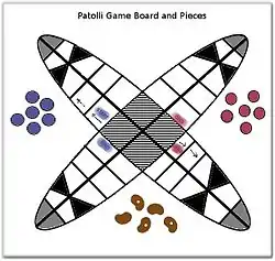 Привертає увагу точний збіг патоллі з маянською технікою лічби. В неї грає від 2 до 4 осіб одночасно. Гра проводиться на діагонально розташованих лініях, розкреслених в квадрати, з використанням червоних і синіх фішок (розфарбовані камінчики або боби) і 5 бобів з поглибленнями з одного боку, (іноді використовуються 4) як кубиків.