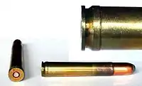 - Фіксація патрона в патроннику здійснюється упором виступає закраїни (фланця, ранта, капелюшки) гільзи у казенний зріз ствола. У цьому випадку забезпечується міцна і надійна фіксація, а гільза і патронник можуть бути виготовлені з великими допусками по довжині. Однак виступає закраїна гільзи вимагає збільшення поперечних розмірів вузла замикання, а отже — затвора, відповідно ростуть габарити і вага зброї в цілому, а в казенному зрізі ствола доводиться робити виріз для проходу екстрактора, що ускладнює його виготовлення; крім того, що виступає закраїна гільзи істотно ускладнює проектування механізму подачі боєприпасів і (у разі магазинного харчування) істотно знижує ємність магазину.