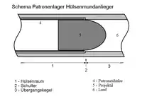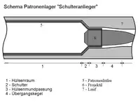- Фіксація патрона в патроннику здійснюється за рахунок упору циліндричного виступу гільзи, виконаного у її заснування, в уступ казеннику. Цей спосіб використовується в системах великого калібру або для особливо потужних стрілецьких боєприпасів. Він забезпечує дуже міцну і надійну фіксацію, але вимагає використання складних і дорогих у виробництві гільз зі спеціальним потовщенням стінок в донної частини, а також патронника з відповідною розточенням в казенній частині.