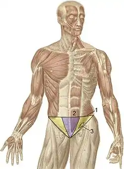 • присередньо — бічний край прямого м'яза живота.