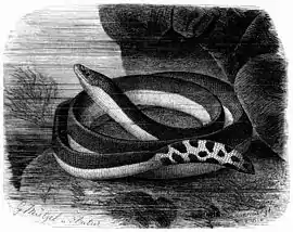 Верхня частина тулуба чорна або темно-коричнева, різко контрастує з кремовою, жовтуватою або палево-світло-коричневим кольором черева. З боків є поздовжні світлі смуги або на всій поверхні тіла малюнок з поперечних кілець. Хвіст світлий з великими чорними плямами, що утворюють на його верхньому краю зубчастий візерунок.