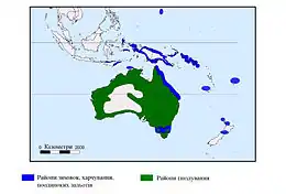 Австралійський пелікан зустрічається практично на всій території Австралії, Папуа Нової Гвінеї та в Західній Індонезії. Поодинокі зальоти зареєстровані в Новій Зеландії та на різних островах заходу Тихого океану (Палау, архіпелаг Фіджі та ін.) В Австралії цей пелікан може бути знайдений як на прісних водоймах, так і на морських узбережжях, болотах, в естуаріях, на внутрішніх тимчасових водоймах (оз. Ейр та ін), прибережних островах та в заплавах річок.
