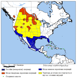 Північна межа гніздування проходить приблизно по 61° північної широти. Цей пелікан досить звичайний в США та Канаді, але на атлантичному узбережжі континенту на північ від півострова Флорида в останні 100 років став рідкісним.