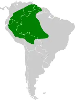 Вид поширений у верхньому басейні річки Оріноко і західній частині Амазонки в Болівії, Бразилії, Колумбії, Еквадорі, Французькій Гвіані, Перу, Суринамі і Венесуелі. Мешкає у хмарному лісі, сезонно затоплюваних лісах та у низинних вологих тропічних лісах.[3]