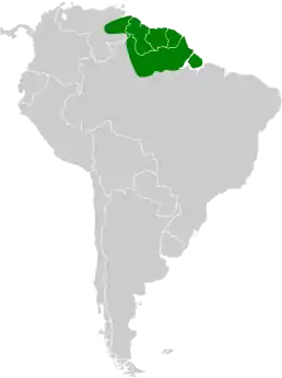 Поширений у східній частині Венесуели, в Гаяні, Суринамі, Французькій Гвіані та на півночі Бразилії на північ від річки Амазонки та на схід від річки Ріу-Бранку. Населяє зрілі тропічні ліси, хоча його можна знайти і у вторинних лісах.[3][4]