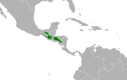 Вид поширений на півдні Мексики, в Гватемалі, Гондурасі, Сальвадорі та на півночі Нікарагуа. Населяє вологі передгірські та гірські широколистяні ліси субтропічних і помірних зон на схилах Тихого океану та Карибського басейну. Середовище проживання — вологі широколистяні гірські ліси, переважно хмарні ліси та сосново-дубові ліси, але також спостерігається у вторинних лісах та насадженнях.