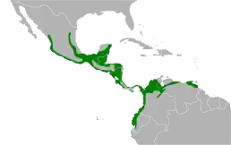 Вид поширений в Центральній Америці та на півночі Південної Америки від Мексики до Еквадору. Живе в тропічних і субтропічних районах, на висоті від 0 до 2500 метрів над рівнем моря.