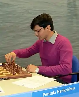 Making his first appearance in the Tata Steel A group in January 2013, Harikrishna finished in seventh place with 6.5/13 and breaking 2700 for the first time.[50] Despite a collapse of form at the Capablanca Memorial in which Harikrishna scored 3/10, losing four games and failing to win and pushing him back under 2700,[51] his form returned in July with a strong performance in the Greek league, winning at the Biel Masters with 8½/11 and tied fifth place at the HZ Open with an unbeaten 7/9.[52][53]
