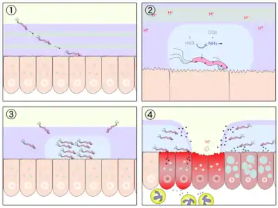 (1) Бактерія проникає до слизової оболонки шлунку.