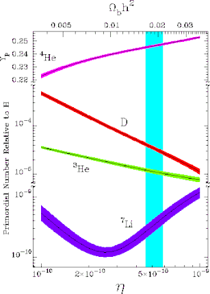 Найважливіший параметр розрахунків відносного змісту первинних елементів -- питома ентропія на 1 баріон, яка не змінюється в ході розширення. Ця величина також може бути виражена в показниках щільності баріонів (-- фізична баріонна густина). Таким чином, теоретично визначається хімічний склад первинної (дозоряної) речовини за кількістю атомів. Числа, що зазначені на початку, добре співвідносяться з сучасними розрахунками за спектрами далеких квазарів.