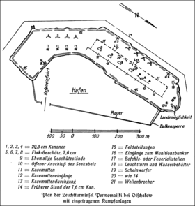 Побудовані військовими інженерами Борисовим і Паукером укріплення казематованої батареї мали 12 кругових і 6 підйомних 203-мм гармат, які після пострілу опускалася в шахту і були недоступними для удару у відповідь. На молу були встановлені мортири. Будівництво острова закінчено в грудні 1880 року[1].