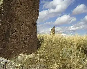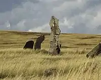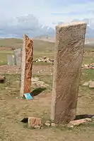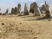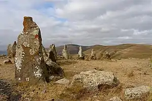 - менгір — вертикальний камінь, висотою іноді до 20 м; у Франції зустрічаються поля таких стовпів, що тягнуться на 2—3 км; вони були або об'єктом поклоніння, або позначали місце церемоній:;