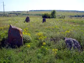 - дольмен — кам'яний ящик, найпростіший його варіант — два вертикально поставлені плоскі камені, перекриті третім; дольмени, як правило, служили місцем поховання членів роду;