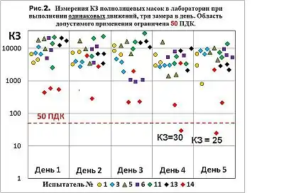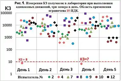 В дослідженні [2] вимірювалися коефіцієнти захисту респіраторів — півмаски і повно-лицьової маски, у разі носіння респіраторів одними і тими ж людьми в лабораторії при виконанні однакових рухів (Мал. 1 і 2). Виконувалося три виміри кожного дня. У деяких випробувачів коефіцієнти захисту (відношення середньої концентрації аерозолю зовні маски до середньої концентрації під маскою) були дуже різноманітними, і іноді вони великі, а іноді — маленькі.