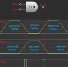 - На вході 1 — високий рівень («1»), на вході 2 низький рівень («0»). На виході низький рівень («0»).