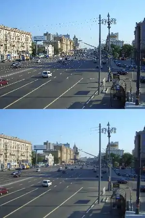 Перший етап є необхідним для виключення накладання спектрів, природа якого аналогічна накладанню спектрів при початковій дискретизації аналогового сигналу.[15] Накладання спектрів є особливо помітним на тих ділянках сигналу, які мають значні високочастотні спектральні складові. Так, на наведених на початку статті фотографіях небо практично не піддалося накладанню спектрів, але ефект стає помітним, якщо звернути увагу на різкі переходи.