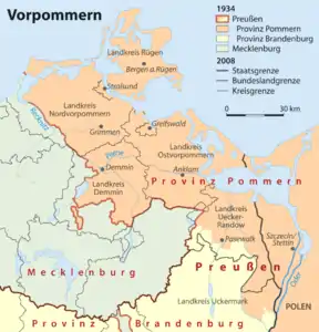 Німецька Передня Померанія сьогодні розуміється як острови Рюген і Узедом і прилеглий материк, що приблизно відповідає адміністративним районам Передня Померанія-Рюген і Передня Померанія-Грайфсвальд, хоча кордони цих районів з власне Мекленбургом не відповідають демаркації до 1945 року.