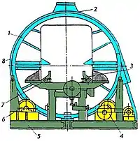 Круговий перекидач (див. рис.) , який застосовують для розвантаження одиночних вагонеток в нерозчіплених составах, являє собою металевий каркас (барабан) 1, розташований на привідних (4) і підтримуючих (6) роликах рами 5. Всередині його закріплені рейки 7, стопори і упори 3. Пил, що утворюється при роботі, відсмоктується із кожуха 8 через вентиляційний патрубок 2.