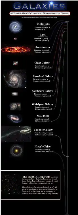 Існує близько 50 галактик Місцевої групи (див. повний список у списку найближчих галактик), близько 100 000 галактик у нашому місцевому надскупченні, а загальна кількість у всьому видимому Всесвіті оцінюється у 100-200 мільярдів галактик.
