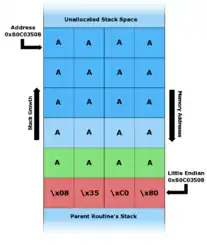 Канонічний метод експлуатації переповнення стекового буфера є затирання адреси повернення в функцію, яка викликала (caller) поточну функцію (callee) вказівником на контрольовані хакером дані (зазвичай на той же стек).[3][6] Це ілюструється в прикладі нижче: