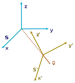 - де x, y, z, t — координати події в системі K; x′, y′, z′, t′ — координати тієї ж події в системі K′; V — відносна швидкість двох систем; c — швидкість світла.