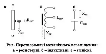 Ці елементи змінюють вихідну величину пропорціонально вхідному переміщенню: електричний опір R, індуктивність L і ємність С.