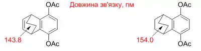 У той же час, наведена справа сполука не здатна розкладатися за цією реакцією внаслідок відсутності подвійного зв'язку. Згідно з принципом структурної відповідності можна очікувати, що в біциклічній сполуці зліва, містковий зв'язок вуглець-вуглець має бути коротший ніж у біциклічній сполуці справа, оскільки при наближенні до перехідного стану цей зв'язок набуває характеру подвійного зв'язку. І дійсно, це передбачення підтвердилося рентгеноструктурним аналізом.