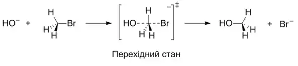 Перехідний стан відповідає найвищій енергії вздовж даної координати реакції (хоча і не обов'язково найвищій енергії на поверхні потенціальної енергії). При цьому приймається припущення про ідеальну необоротність реакції, при якій система, що прийшла з конфігурації реагентів у перехідний стан більше не вертається до вихідних речовин, а перетворюється лише в продукти.[1] Для прикладу нижче показане утворення перехідного стану під час SN2 реакції бромометану з гідроксид-іоном.