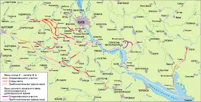 | «И рече Володимеръ: „се не добро есть мало городовъ около Кыева“. И нача ставити городи по ДеснЂ, и по Устрьи, по Трубешеви, и по СулЂ, и по СтугнЂ; и нача нарубати мужи лутши отъ Словенъ, и отъ Кривичъ, и отъ Чюдий, и отъ Вятичь, и отъ сихъ насели и грады; бЂ бо рать отъ ПеченЂгъ, и бЂ воюяся с ними и одоляя имъ.»[5] |