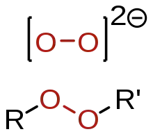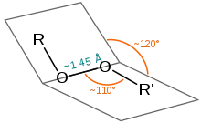 Довжина зв'язку в пероксидах становить близько 1,45 Å, кути (R = H, C) становлять приблизно 110° (подібні до води), а двогранні кути (R = H, C) – приблизно 120°. Енергія дисоціації зв’язку доволі низька – 45-50 ккал·моль-1 (1900-210 кДж·моль-1).[9][10]